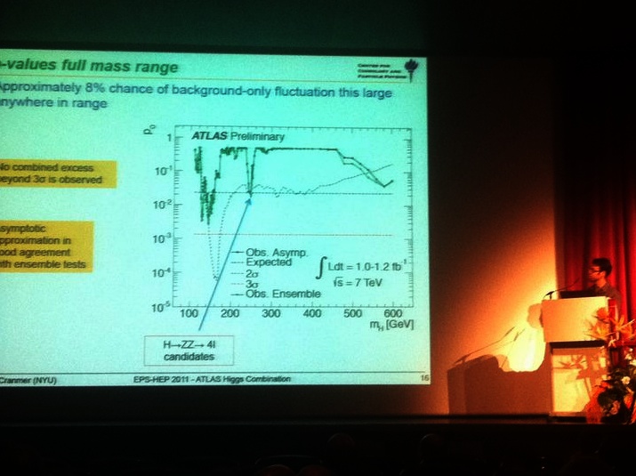 I happened to run into Andrey Korytov after his eagerly awaited CMS Higgs talk. No, CMS had not yet seen the Higgs, and ATLAS could breathe a sigh of relief.