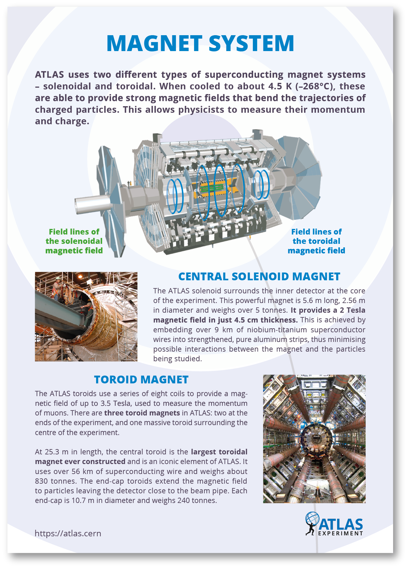 Magnet System Sheet Type Fact ATLAS uses two different types of superconducting magnet systems – solenoid and toroids. English Spanish French Italian German Portuguese Dutch Czech Listing Priority 5